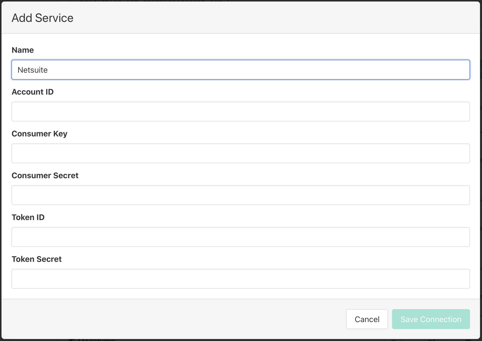 Paste the Account ID of your NetSuite Account, as well as the Consumer Key, Consumer Secret, Token ID and Token Secret created above.